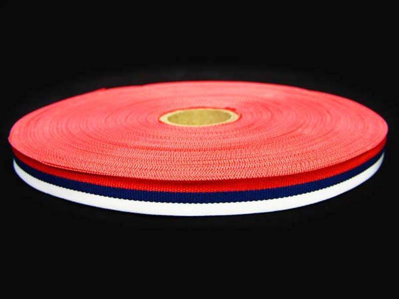 Taśma o szerokości 1,1cm tkana obustronnie w pasy czerwono_granatowo_białe.