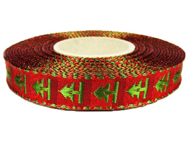 Taśma żakardowa 1,5cm z wyhaftowanymi zielonymi choinkami na czerwonym tle. Brzegi taśmy wyposażono w drucik.
