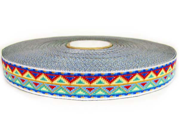 Taśma żakardowa o szerokości 1,6cm o ciekawym wzorze w multikolorze.