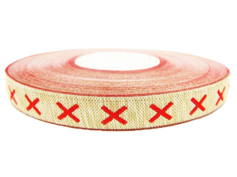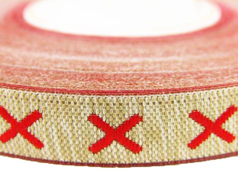 - Taśma żakardowa z haftowanym motywem na beżowym tle.
