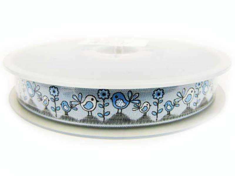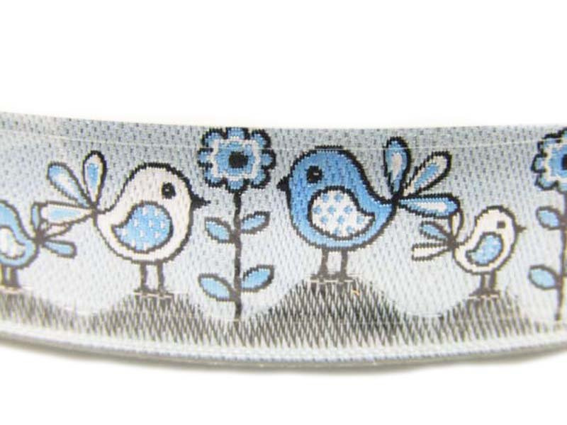 • Taśma żakardowa z pięknie haftowanym motywem na niebieskim tle.