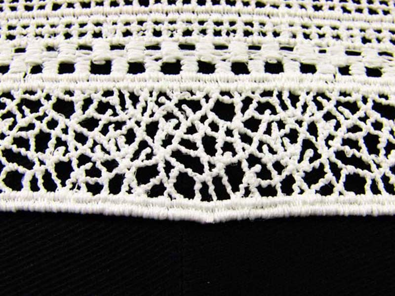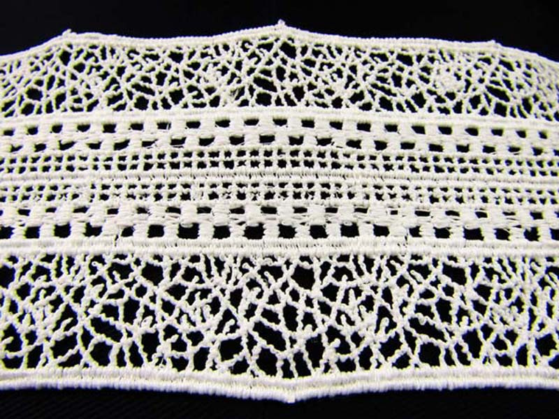 Taśma gipiurowa o szerokości 8cm w formie wstawki w kolorze kości słoniowej.  Koronka zrobiona z matowej nitki.