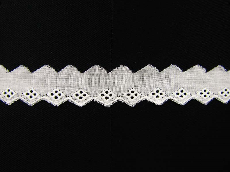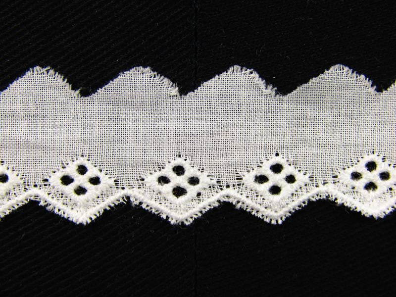 - Koronka batystowa haftowana metodą dziureczkową matową, bawełnianą nitką.