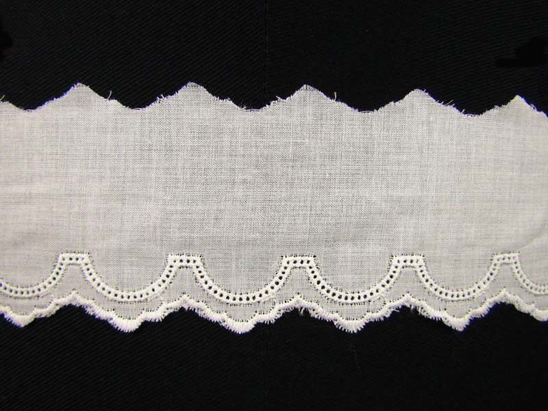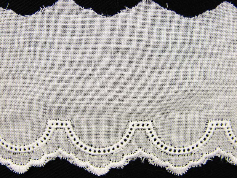 Koronka batystowa haftowana metodą dziureczkową matową nitką bawełnianą.