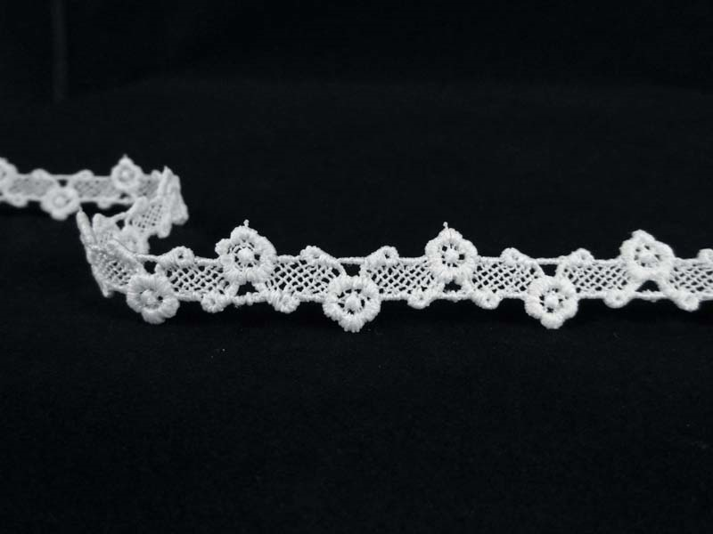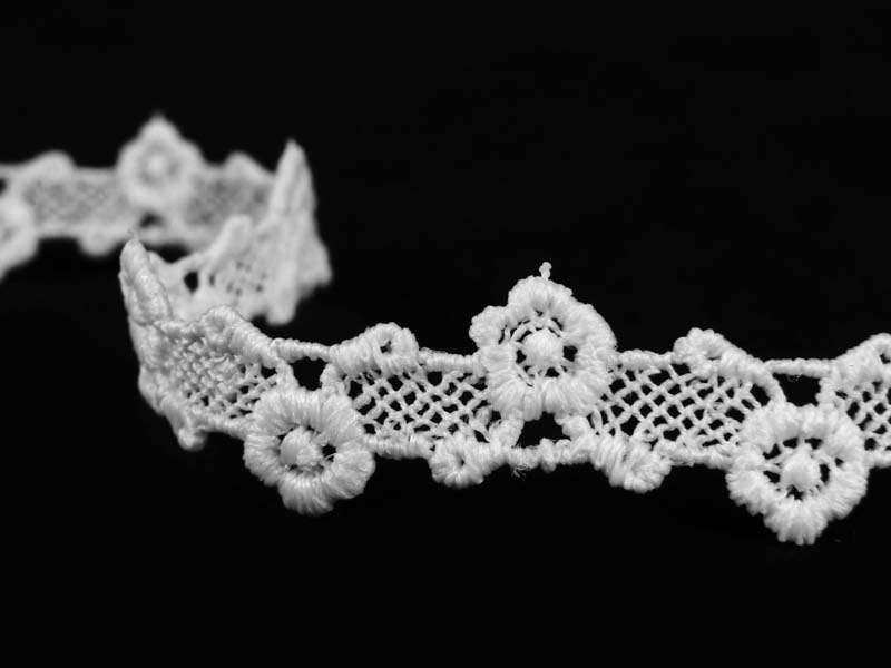 - Koronka gipiurowa o kwiatowym wzorze w formie wstawki - dwustronnie wykończonej w kolorze.