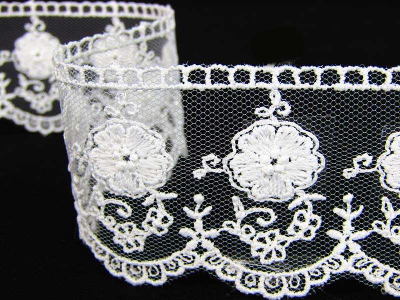- Koronka tiulowa o szerokości 4,5cm w kolorze. Koronka jest dwustronnie wykończona matową nitką.