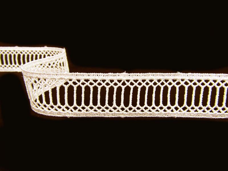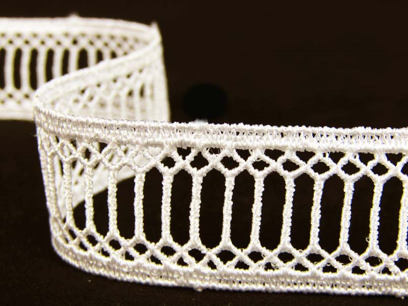 - Koronka gipiurowa o szerokości 2,2cm w formie wstawki w kolorze. Koronka wykonana z błyszczącej nitki.