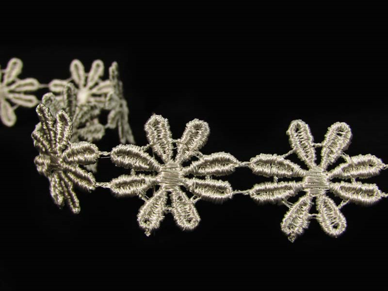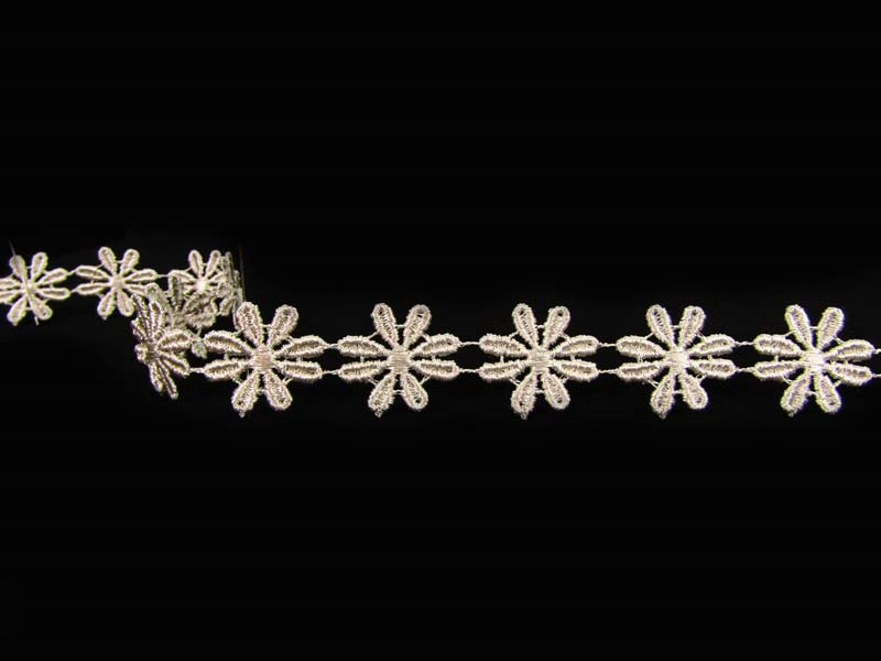 Koronka gipiurowa o szerokości 2,5cm w formie kwiatków. Koronka robiona nitką z połyskiem.