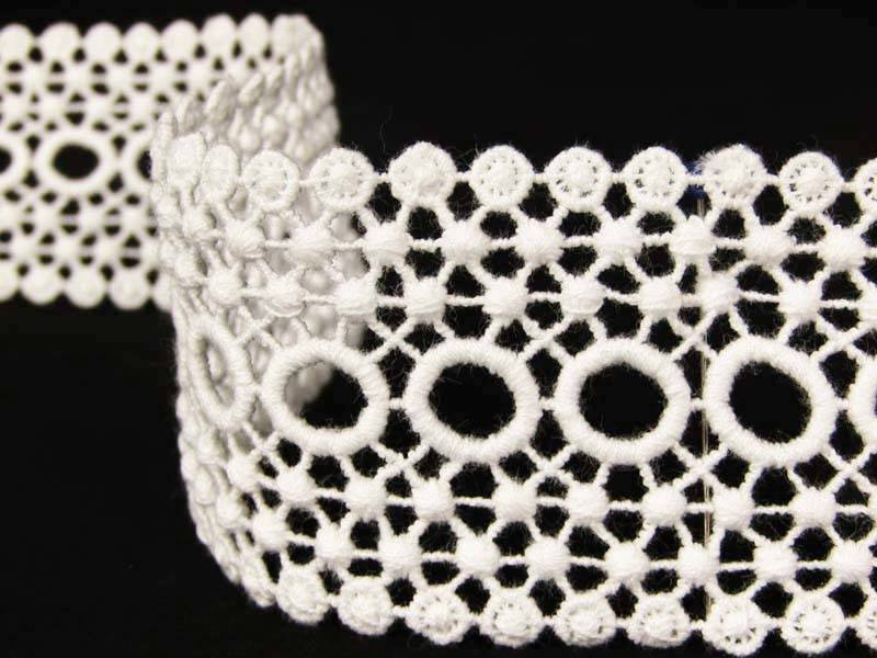 Koronka bawełniana w formie wstawki o szerokości 4,5cm o matowym wykończeniu. Taśma jest miękka i przyjemna w dotyku.