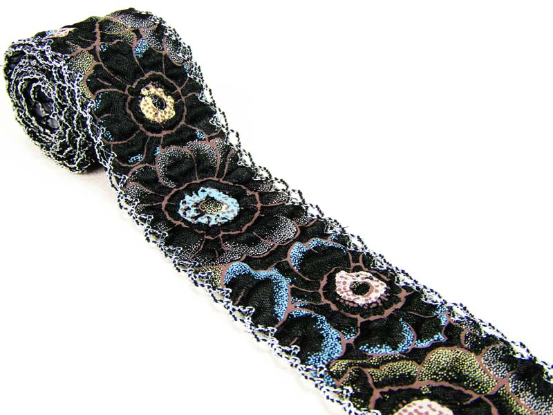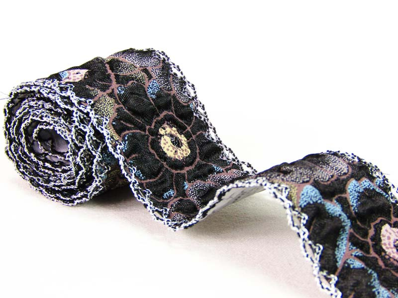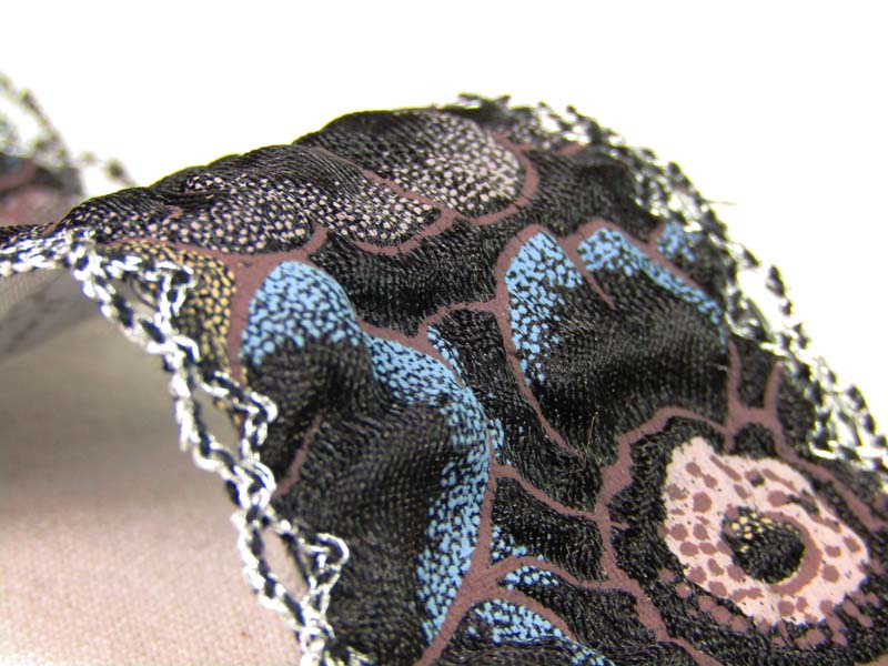 Ozdobna taśma, wykonana z karbowanego atłasu z malowanymi elementami.  Brzegi taśmy wykończone ozdobną, staro srebrną mereżką.