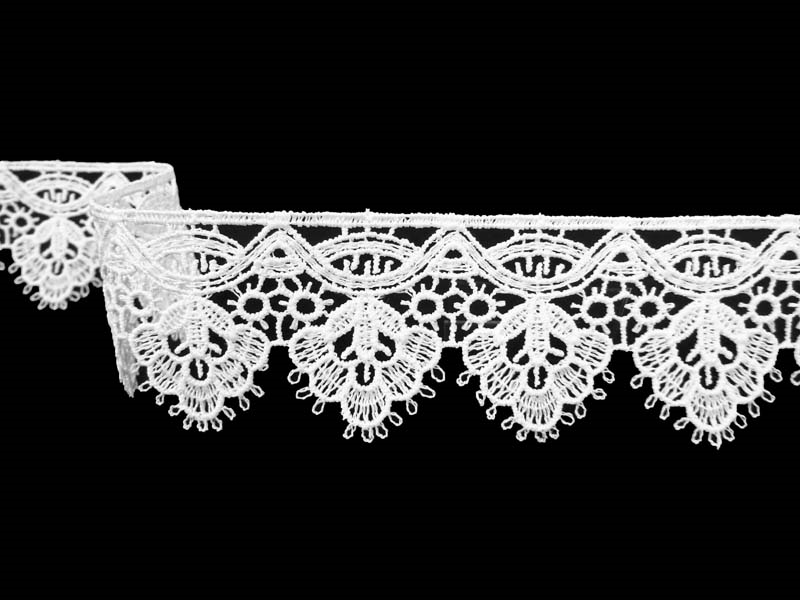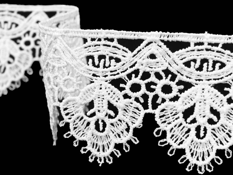 Delikatna, miękka koronka gipiurowa o matowym wykończeniu.