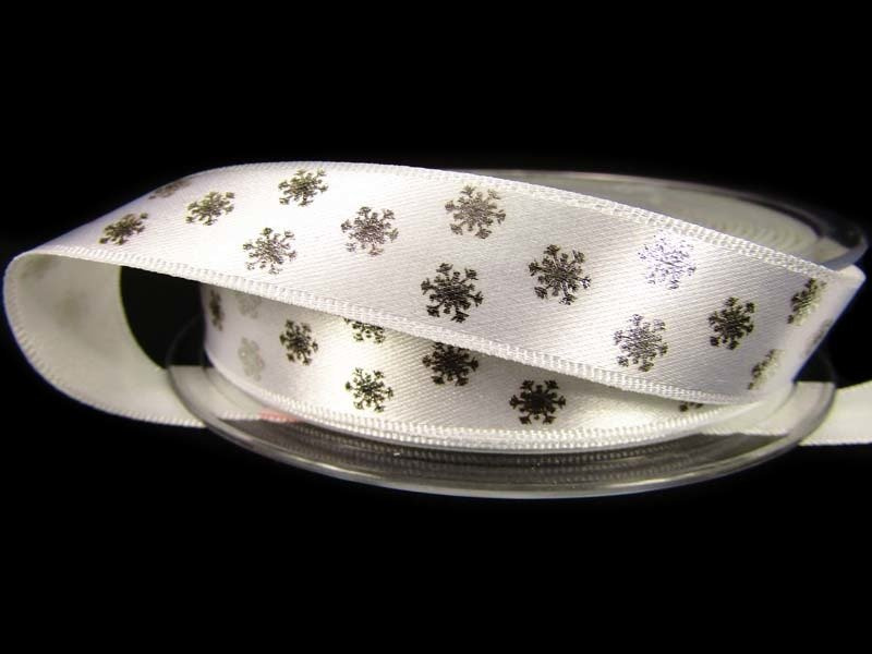 Wstążka 15mm atłas PŁATKI ŚNIEGU biała