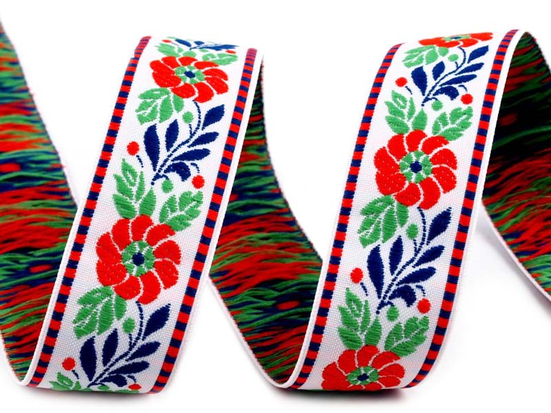 Taśma żakardowa pierwotnie przeznaczona do ozdabiania strojów ludowych, dziś używana jest również do ozdabiania odzieży, tekstyliów do mieszkań, zabawek i przedmiotów upominkowych. Oferuje nieograniczone możliwości zastosowania. Taśma żakardowa tkana maszynowo i wykonana z przędzy poliestrowej.