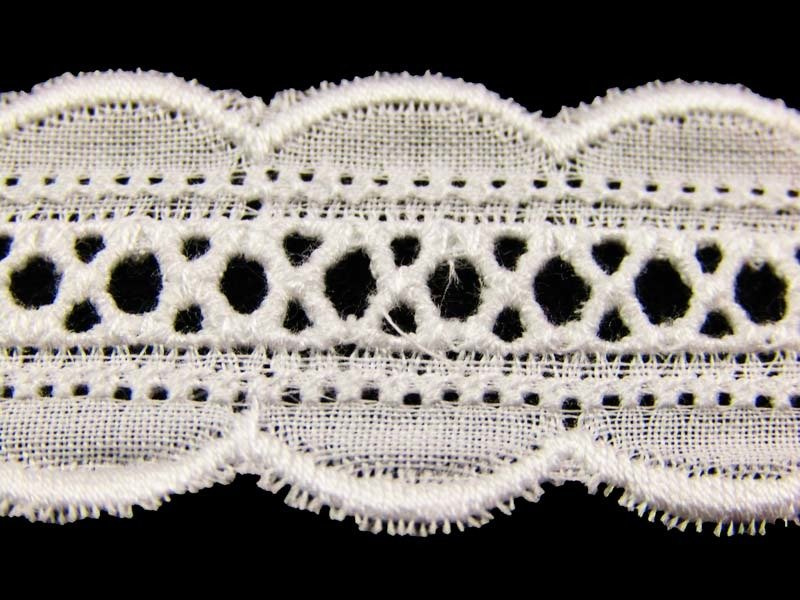 - Koronka batystowa haftowana metodą dziureczkową matową nitką bawełnianą.