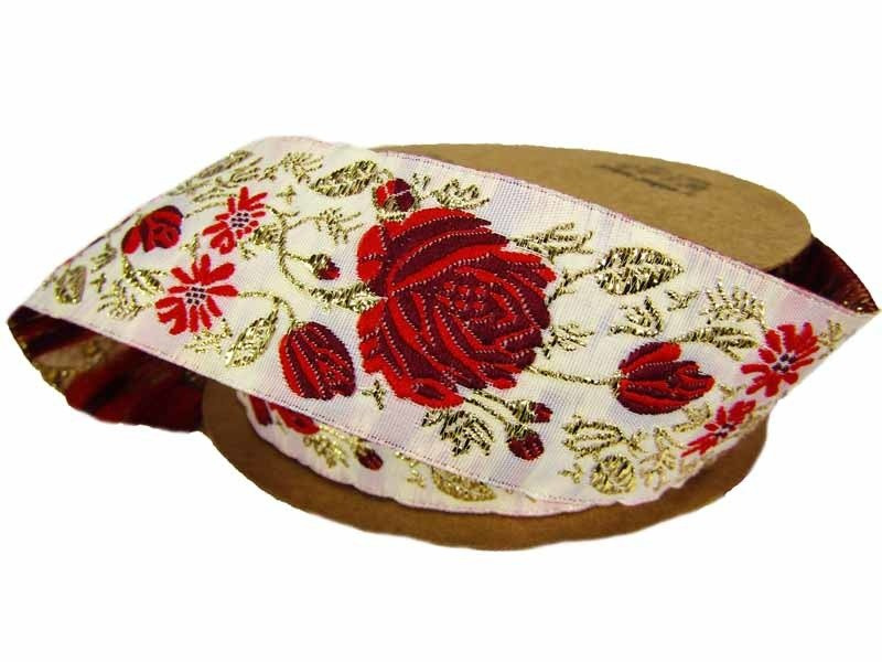 Taśma 35mm żakard RÓŻA czerwono-złota