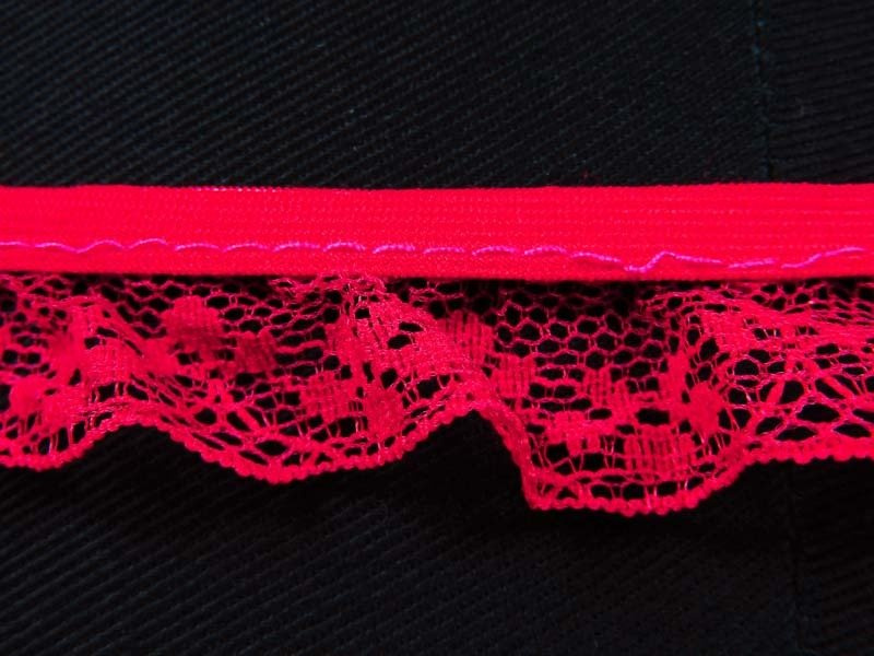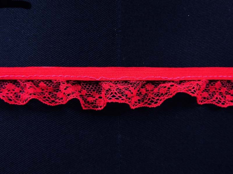Stabilna koronka o szerokości 2,5cm naszyta na wąskiej, płaskiej gumce.