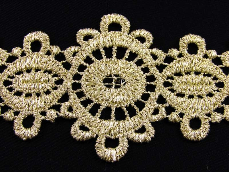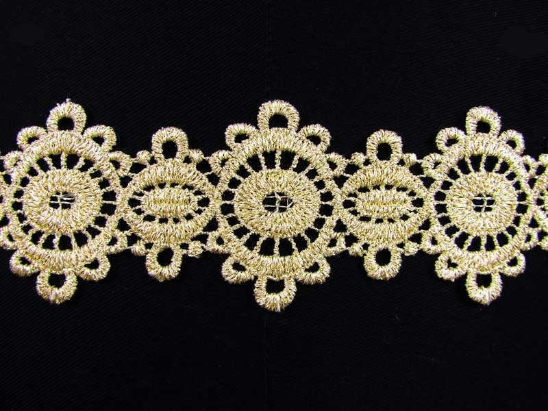 - Koronka gipiurowa z obustronnie równym brzegiem o szerokości 5cm w kolorze złotym.