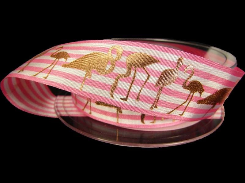 Wstążka o szerokości 2,5m z nadrukiem flamingów w kolorze różowym.