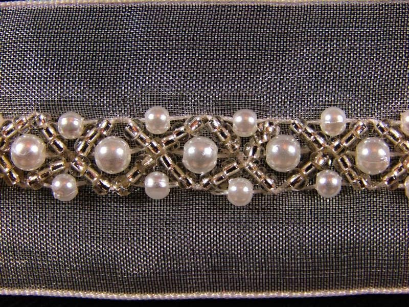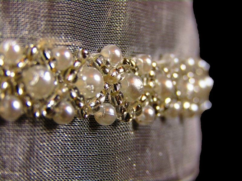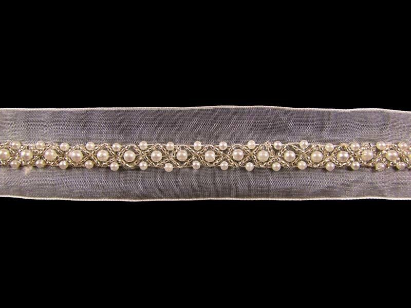 - Ozdobna taśma z organdyny wysadzana perłami i koralikami w kolorze kości słoniowej.