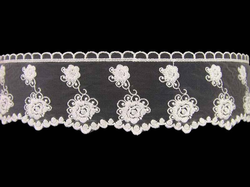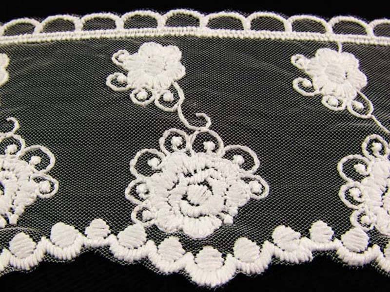 - Koronka tiulowa o szerokości 6,5cm o kwiatowym wzorze. Haft wykonany matową nitką.