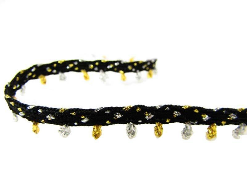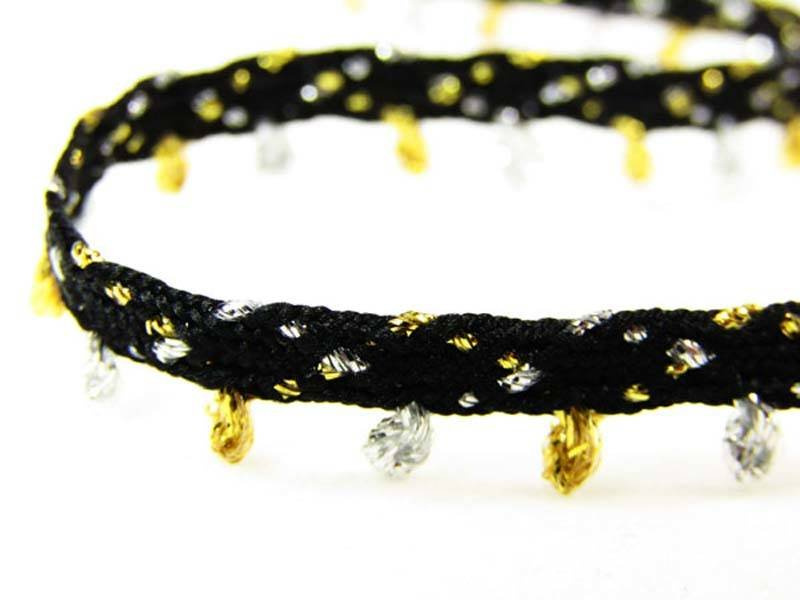 - Taśma o szerokości 0,5cm w formie tkanej taśmy przetykanej złotą i srebrną lureksową nitką oraz wykończona jednostronnie pętelkami.