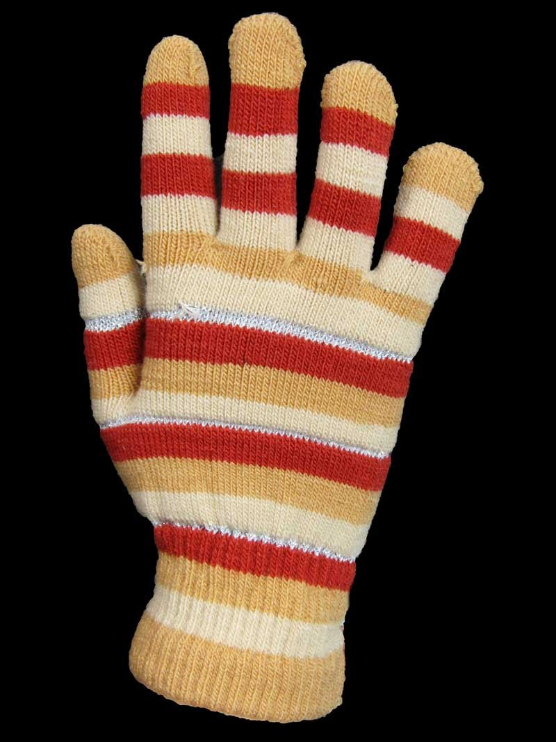 Kolorowa w paski dziana rękawiczka młodzieżowa z dodatkiem srebrnych pasków. Rękawiczka jest pojedyńcza.
