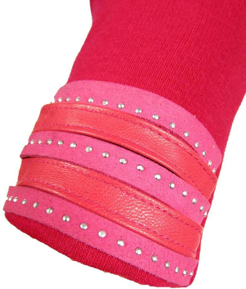 Ocieplana rękawiczka wykonana z matowej dzianiny z dodatkiem ozdobnych pasków z eco-skóry. Tkanina lekko pracuje i dopasowuję się do dłoni. Środek rękawiczki wyłożony sztucznym futerkiem w podobnym kolorze.