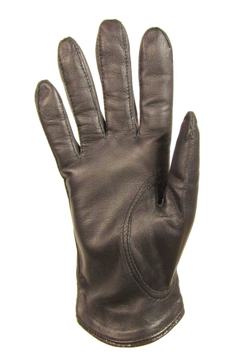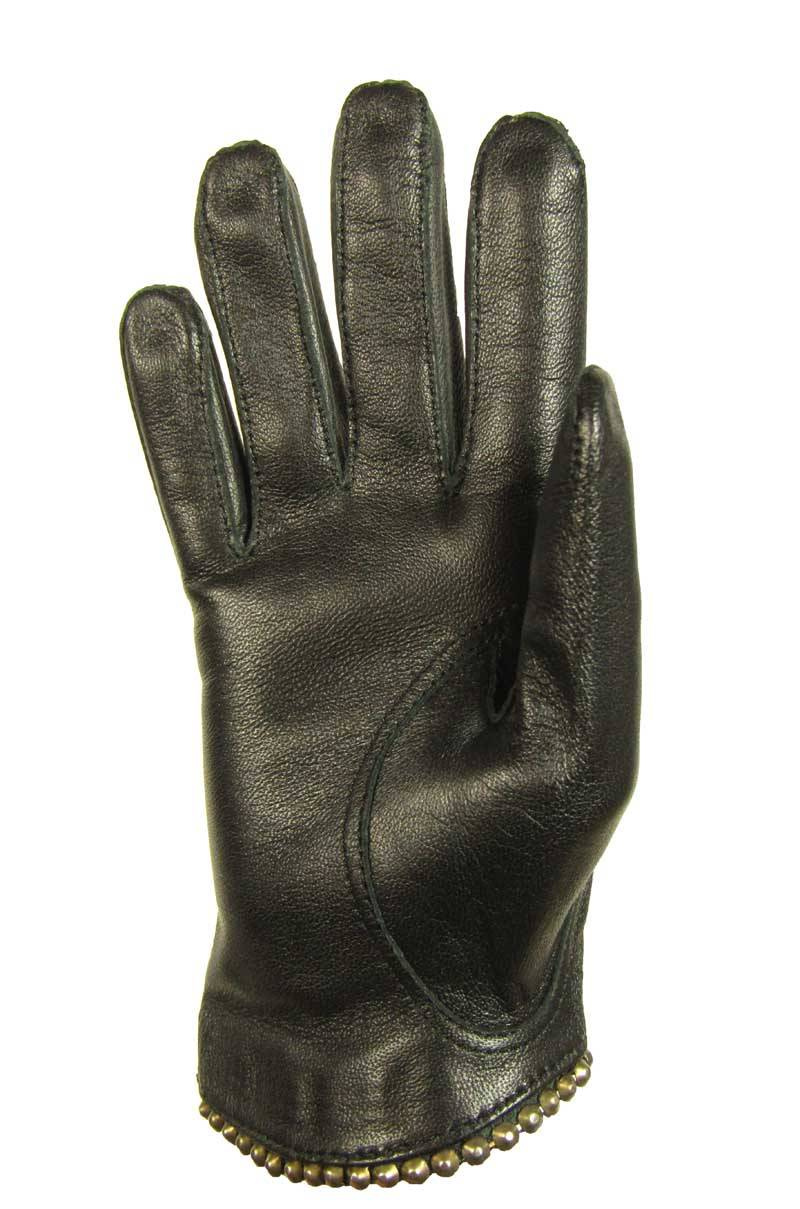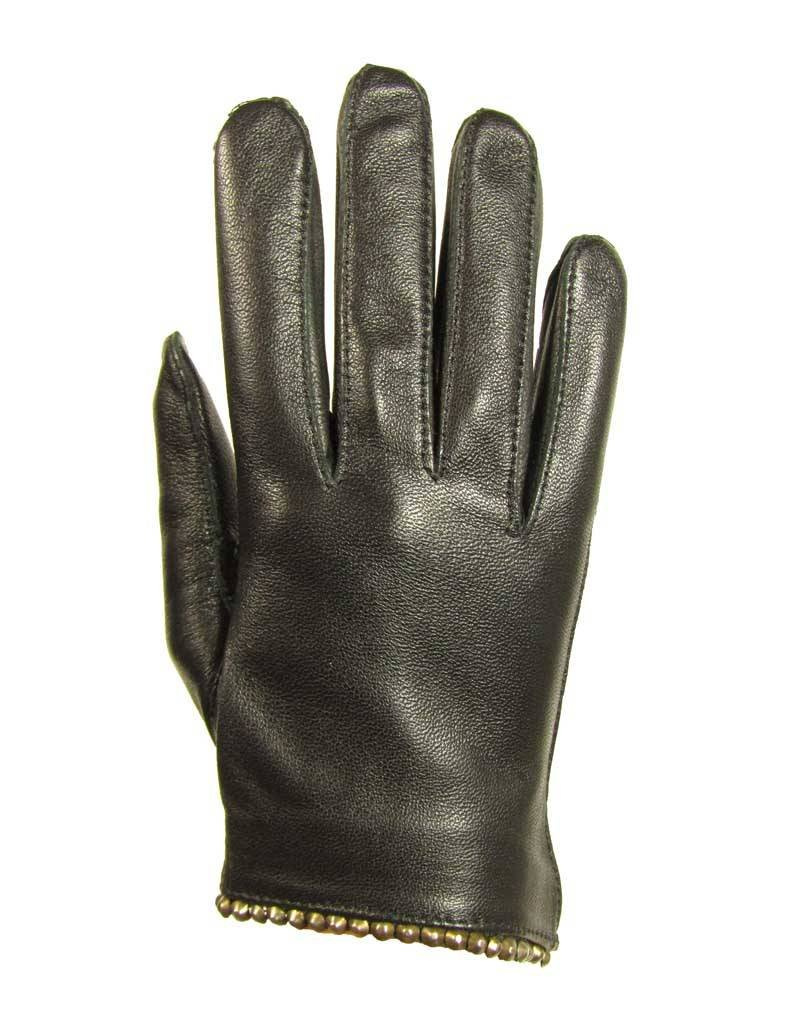 Nieocieplana, damska rękawiczka z naturalnej skóry o krótszym kroju z ozdobnym lamówkowym wykończeniem.