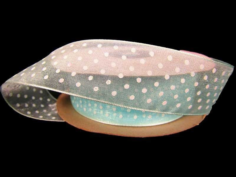 Wstążka z organtyny o szerokości 2,5cm z białym nadrukiem w kropki.