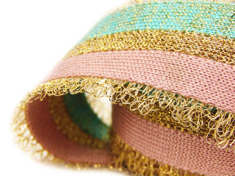 Dziana taśma ozdobna o szerokości 4cm w kolorowe pasy i dwustronnie wykończona złotymi niteczkami.