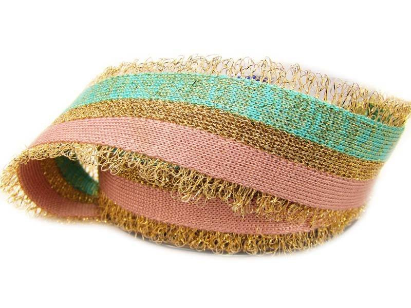 - Dziana taśma ozdobna o szerokości 4cm w kolorowe pasy i dwustronnie wykończona złotymi niteczkami.