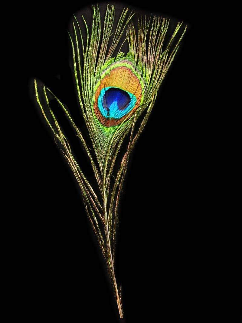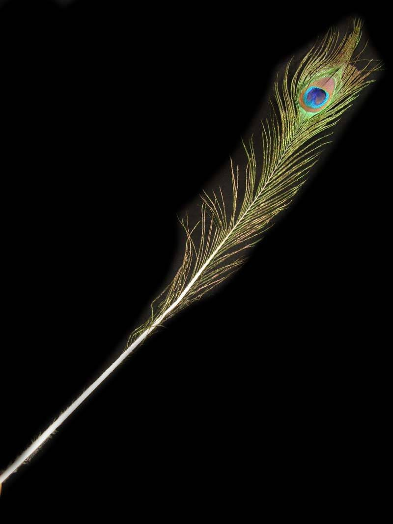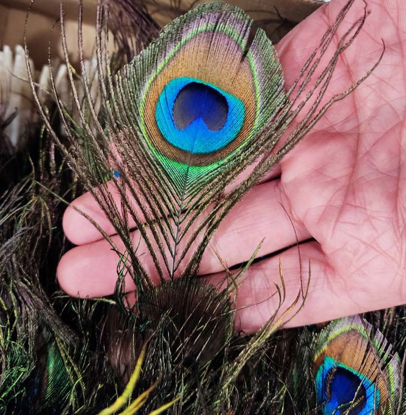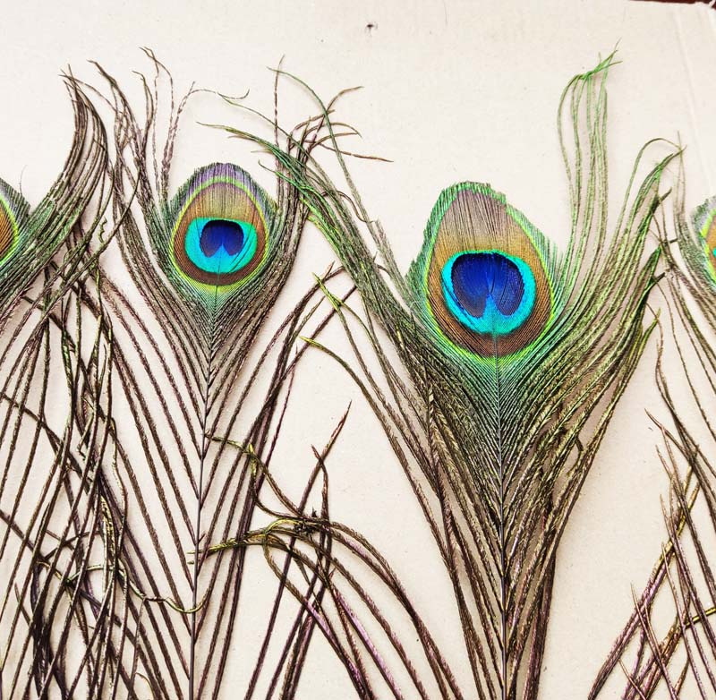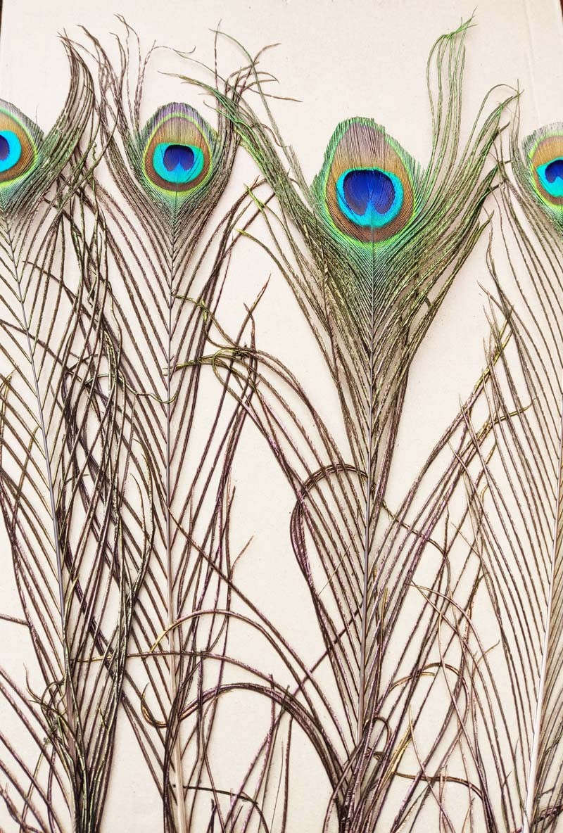 Pawie pióra używane do wyrobu biżuterii czy artykułów wystroju wnętrz. Pióra posiadają przycięte końce nad oczkami.