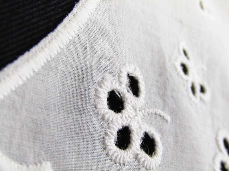 - Duży bawełniany kołnierzyk o matowym wykończeniu i pięknym ażurowym hafcie.