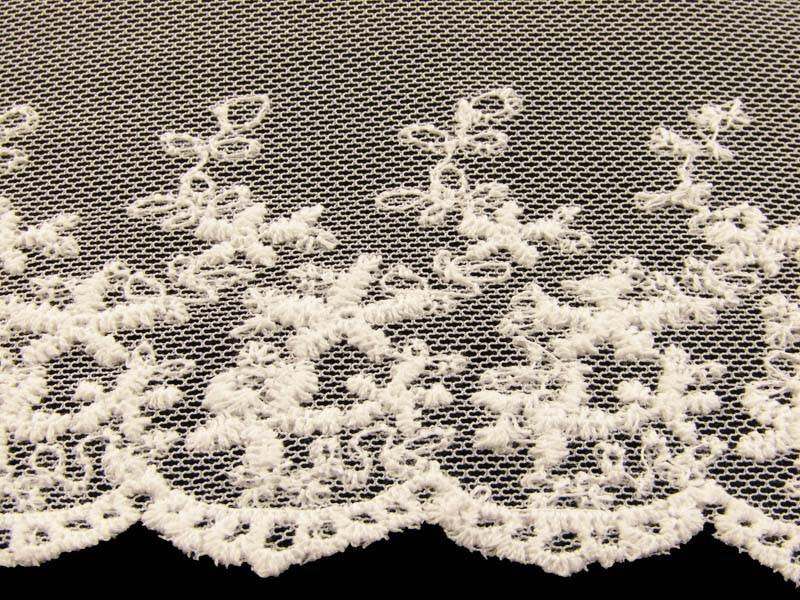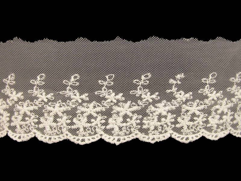 Koronka tiulowa o szerokości 9cm o delikatnym kwiatowym wzorze, wykończona jednostronnie.  Haftowana na miękkim, matowym tiulu bawełnianą nitką.