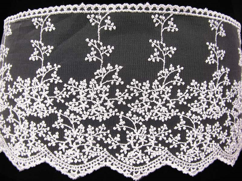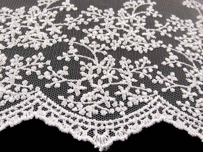 Koronka tiulowa o szerokości 16cm z delikatnym kwiatowym wzorem, wykończona dwustronnie. Koronka haftowana przedzą z połyskiem.