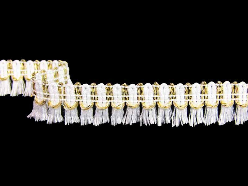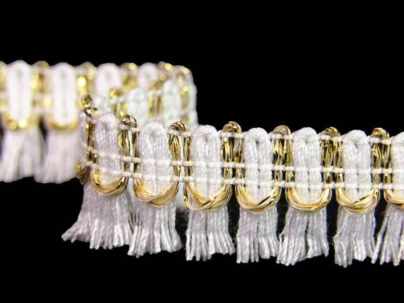 - Taśma ozdobna o szerokości 1,5cm w formie frędzla z domieszką złotej błyszczącej nitki.