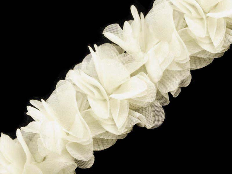 - Trójwymiarowa taśma ozdobna z gęsto ułożonymi odstającymi kwiatami.