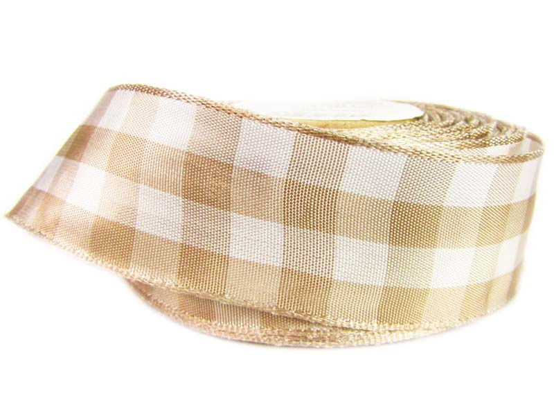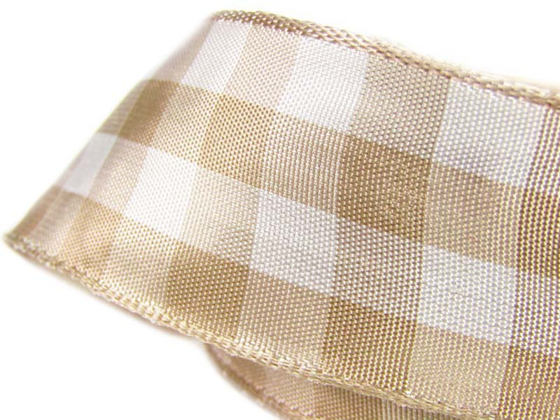 Tkana wstążka o szerokości 40mm w obustronną, dużą kratkę na białym tle. Tasiemka dodatkowo ma na obu brzegach drucik dla łatwiejszego układania. Idealna na duże wieńce.