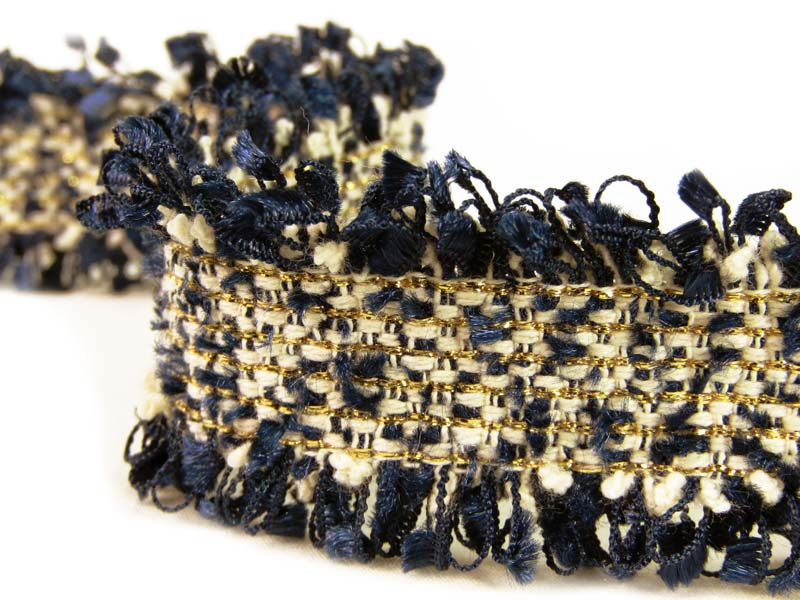 Taśma ozdobna z rodzaju tkanych z obustronnym wykończeniem. Dodatkowo delikatnie przepleciona złotą nitką.
