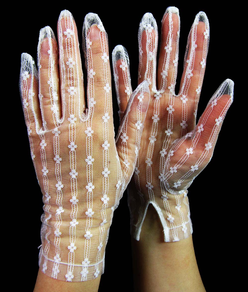 Rękawiczka wykonana z mało elastycznej koronki o matowym wykończeniu. Rękawiczka używana w celach ochronnych, kryjących lub jako dodatek dekoracyjny dłoni.