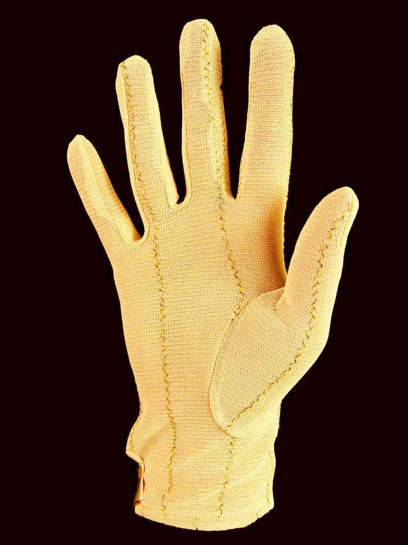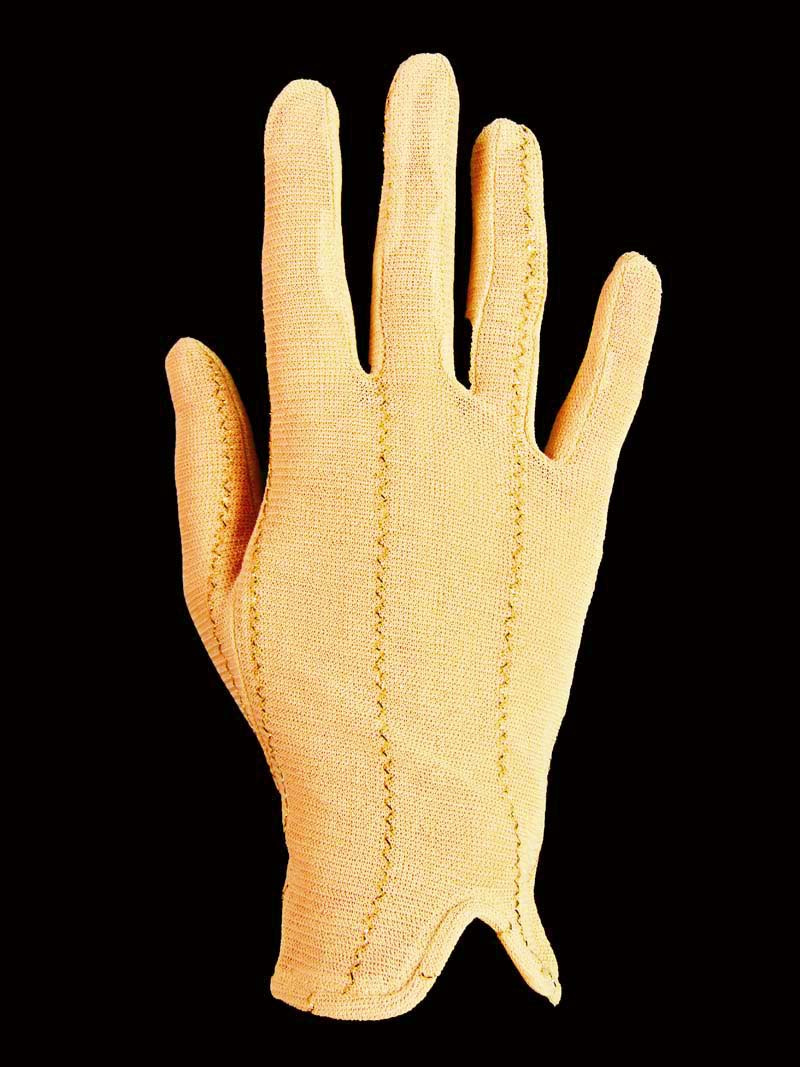 Rękawiczka wykonana z poliestrowej, lekko przejrzystej tkaniny z dodatkiem złotej nitki.