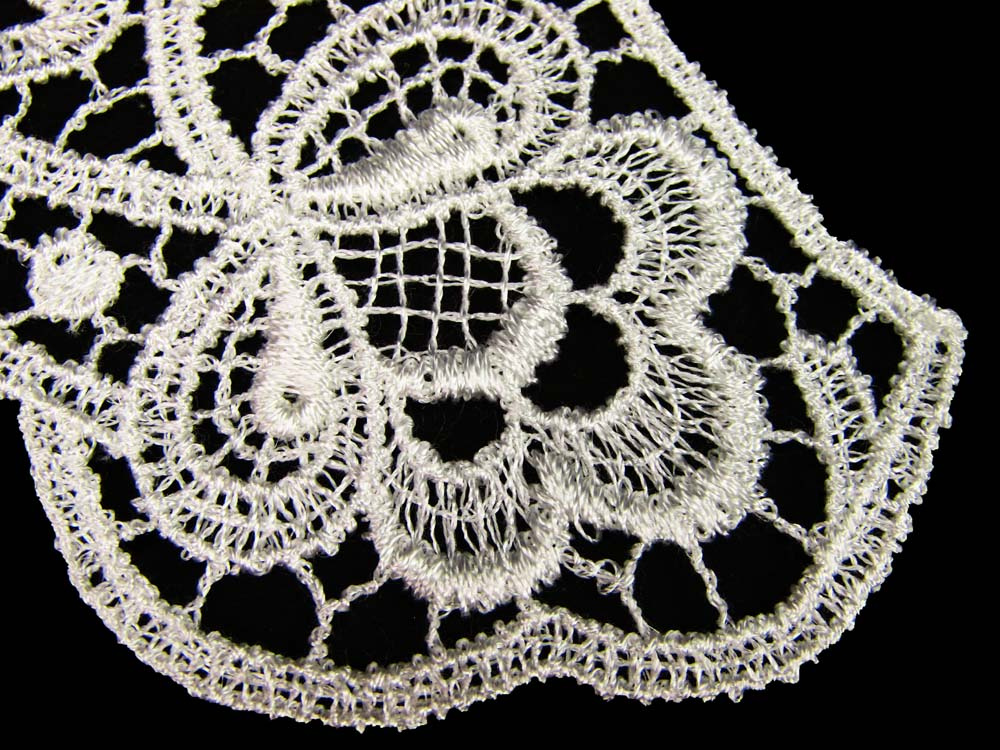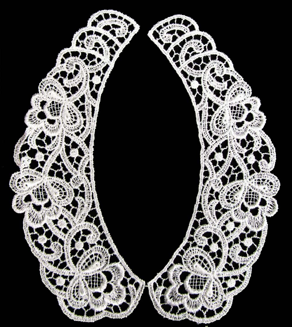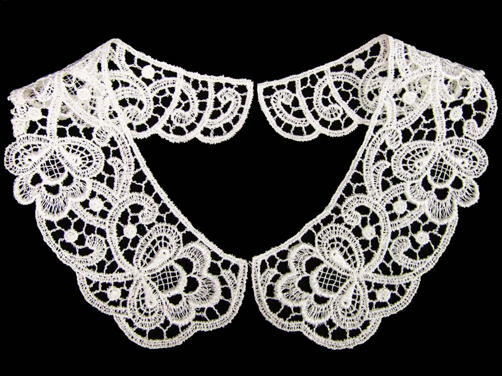 Dwuczęściowy, gipiurowy kołnierzyk o bardzo delikatnej, ażurowej strukturze i błyszczącym wykończeniu.