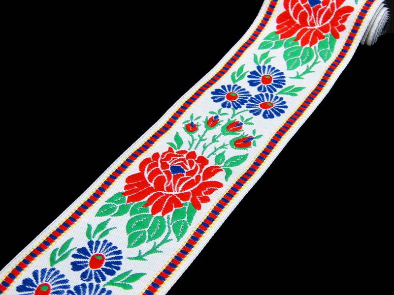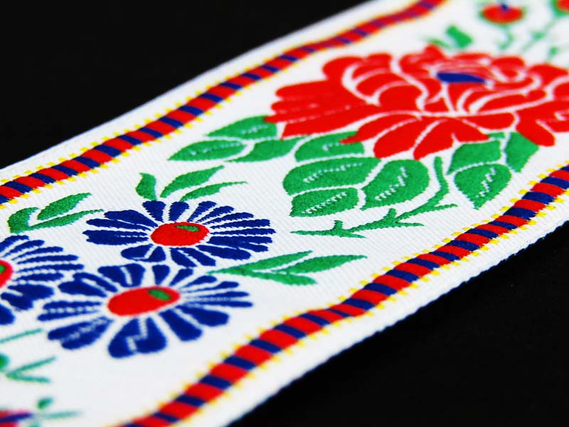Taśma żakardowa pierwotnie przeznaczona do ozdabiania strojów ludowych, dziś używana jest również do ozdabiania odzieży, tekstyliów do mieszkań, zabawek i przedmiotów upominkowych. Oferuje nieograniczone możliwości zastosowania. Taśma żakardowa tkana maszynowo i wykonana z przędzy poliestrowej.