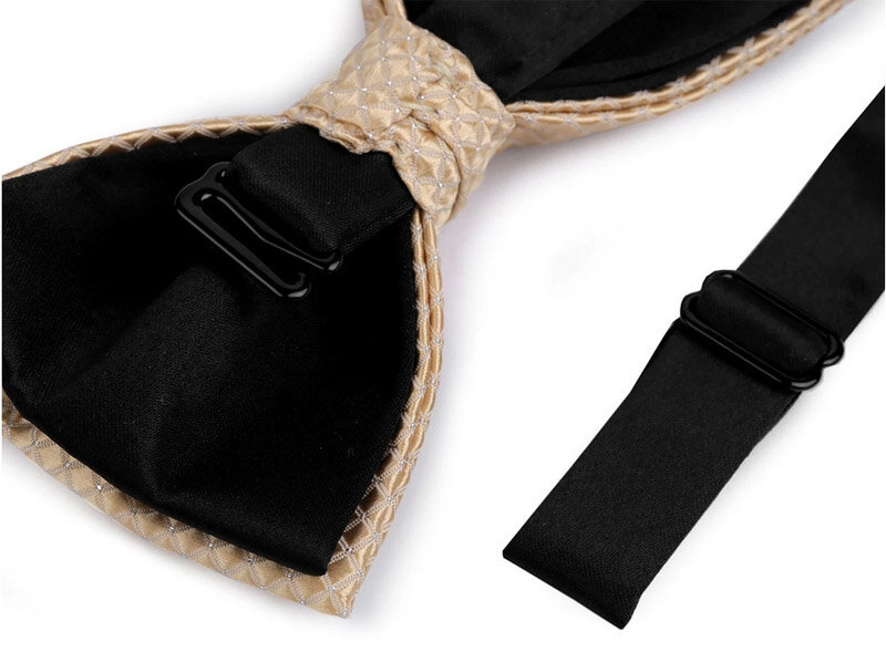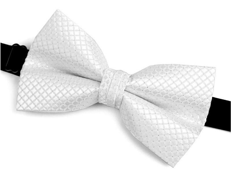 Podwójna muszka wykonana z satyny o fakturze kratki, połyskującej srebrnymi mikro-kropkami. Składa się z dwóch warstw, wierzchniej białej zdobnej i dolnej gładkiej, czarnej. Regulowana satynowym, czarnym paskiem z metalowym zapięciem.