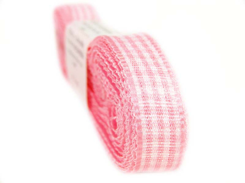- Wstążka tkana o szerokości 10mm o wzorze drobnej kratki z grubszym brzegiem wykończonym tym samym kolorem.