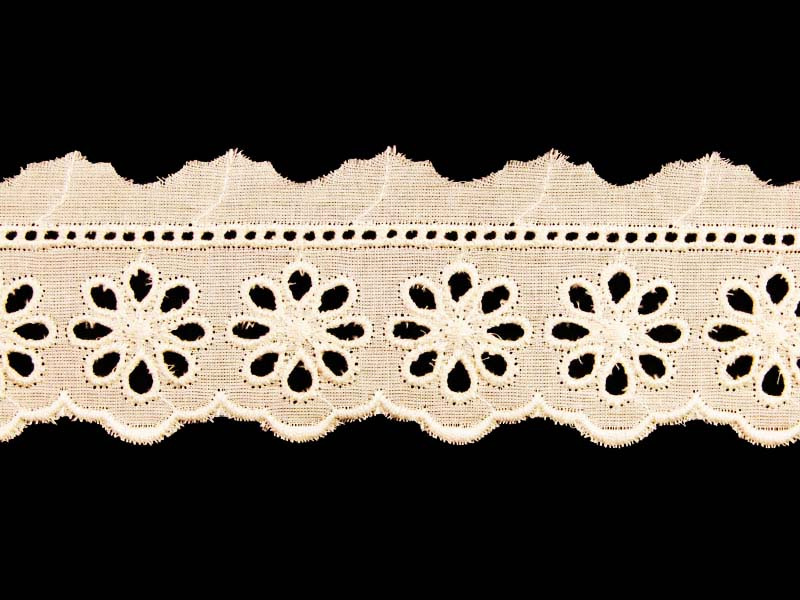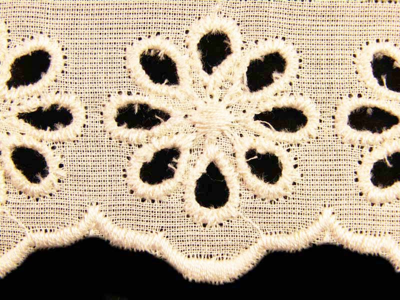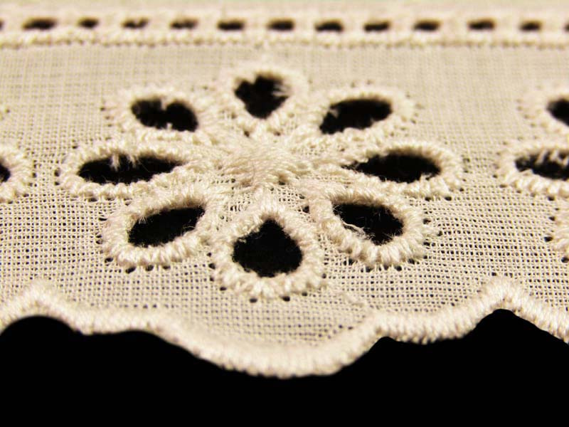 Koronka batystowa haftowana metodą dziureczkową matową nitką bawełnianą.