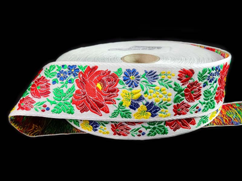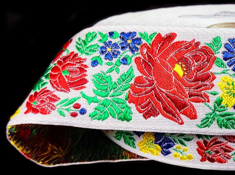 Taśma żakardowa pierwotnie przeznaczona do ozdabiania strojów ludowych, dziś używana jest również do ozdabiania odzieży, tekstyliów do mieszkań, zabawek i przedmiotów upominkowych. Oferuje nieograniczone możliwości zastosowania. Taśma żakardowa tkana maszynowo i wykonana z przędzy poliestrowej.