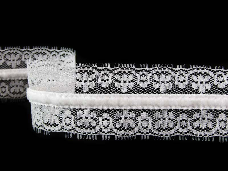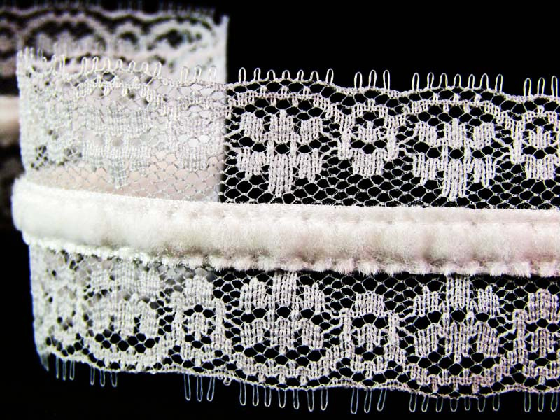 Koronka stabilna o szerokości 3,5cm w formie wstawki z dodatkiem aksamitki w kolorze.