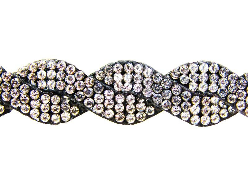 Ozdobna taśma w formie dwu-rzędowego warkocza, wysadzanymi 1mm cyrkoniami w kolorze. Spód taśmy jest pokryty termo klejem do szybkiego i łatwego jej mocowania.