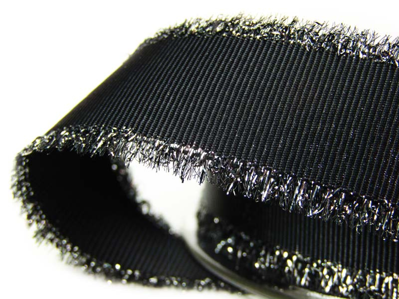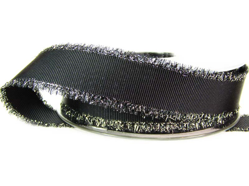 Czarna taśma rypsowa o szerokości 25mm, wykończona obustronnie metalicznym niteczkami.